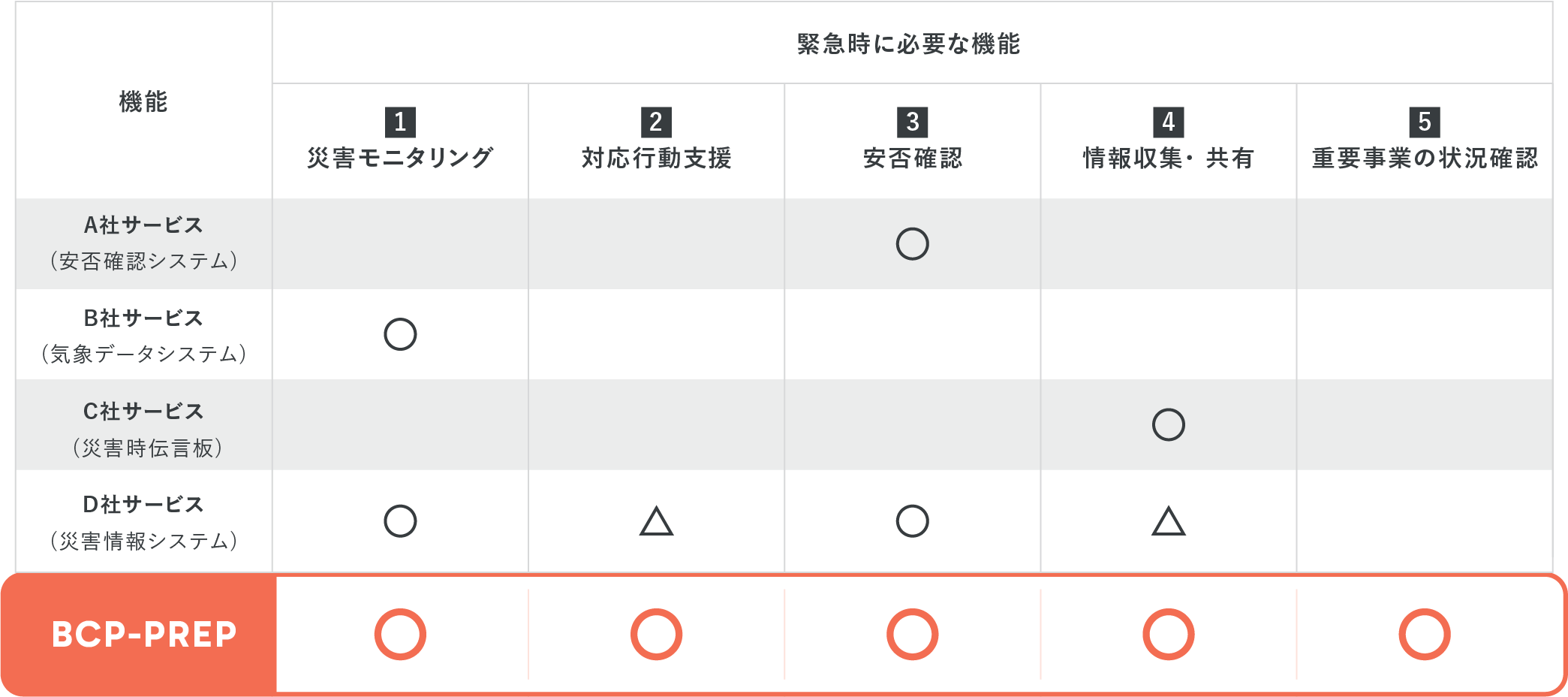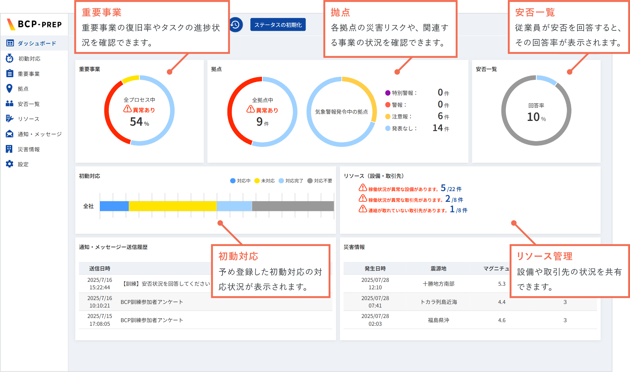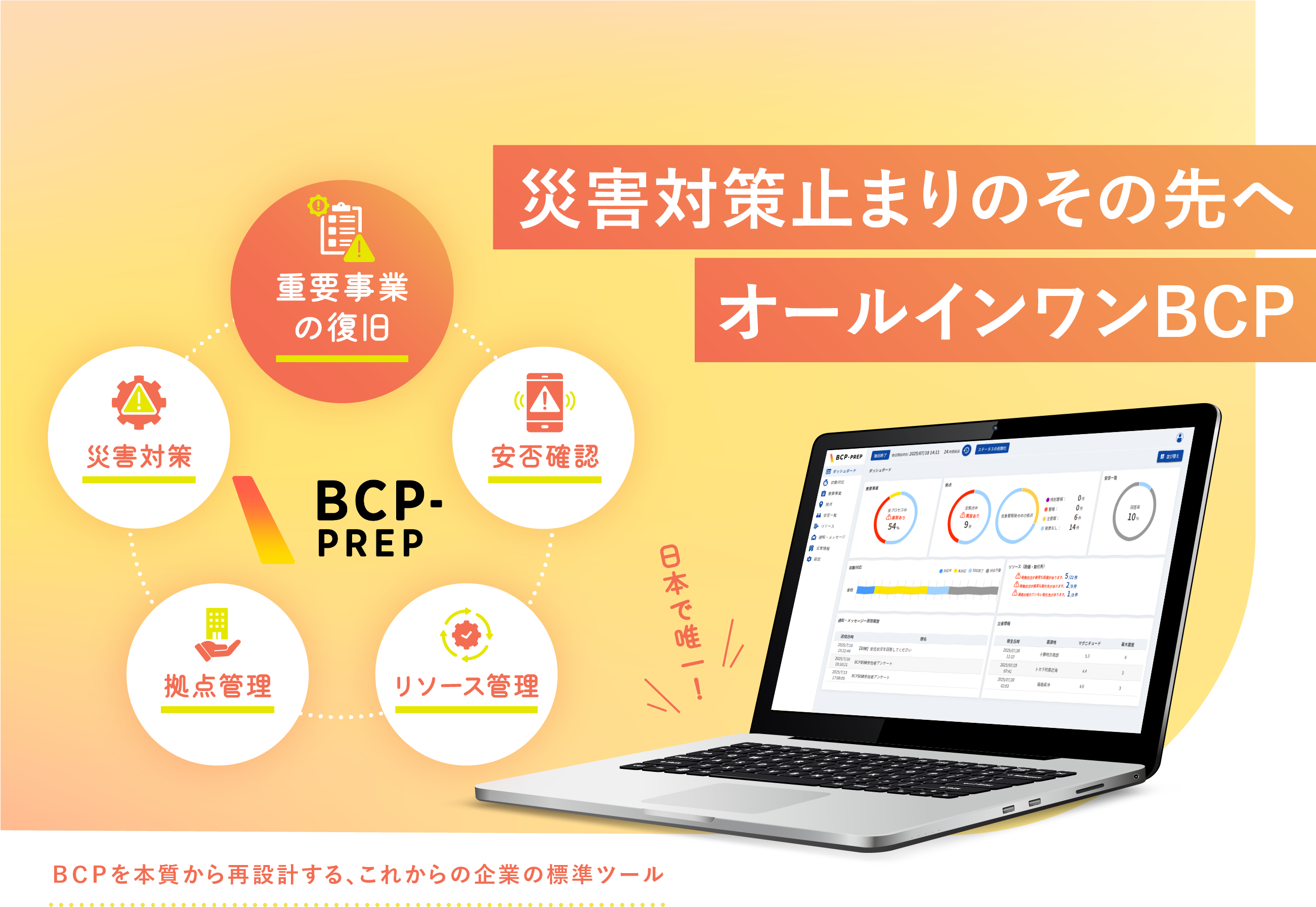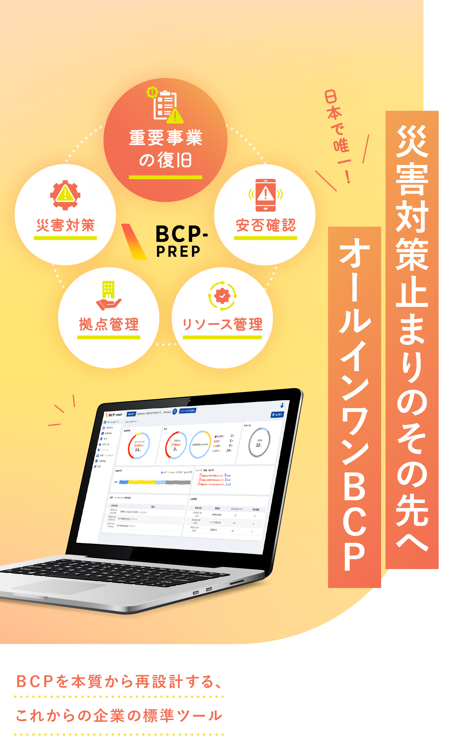 BCP-PREPは、災害対策だけでなく重要事業の継続可否まで把握・管理できる国内唯一のツール。訓練前の準備から、訓練後の見直し・共有まで、すべてアプリ内で完結します。