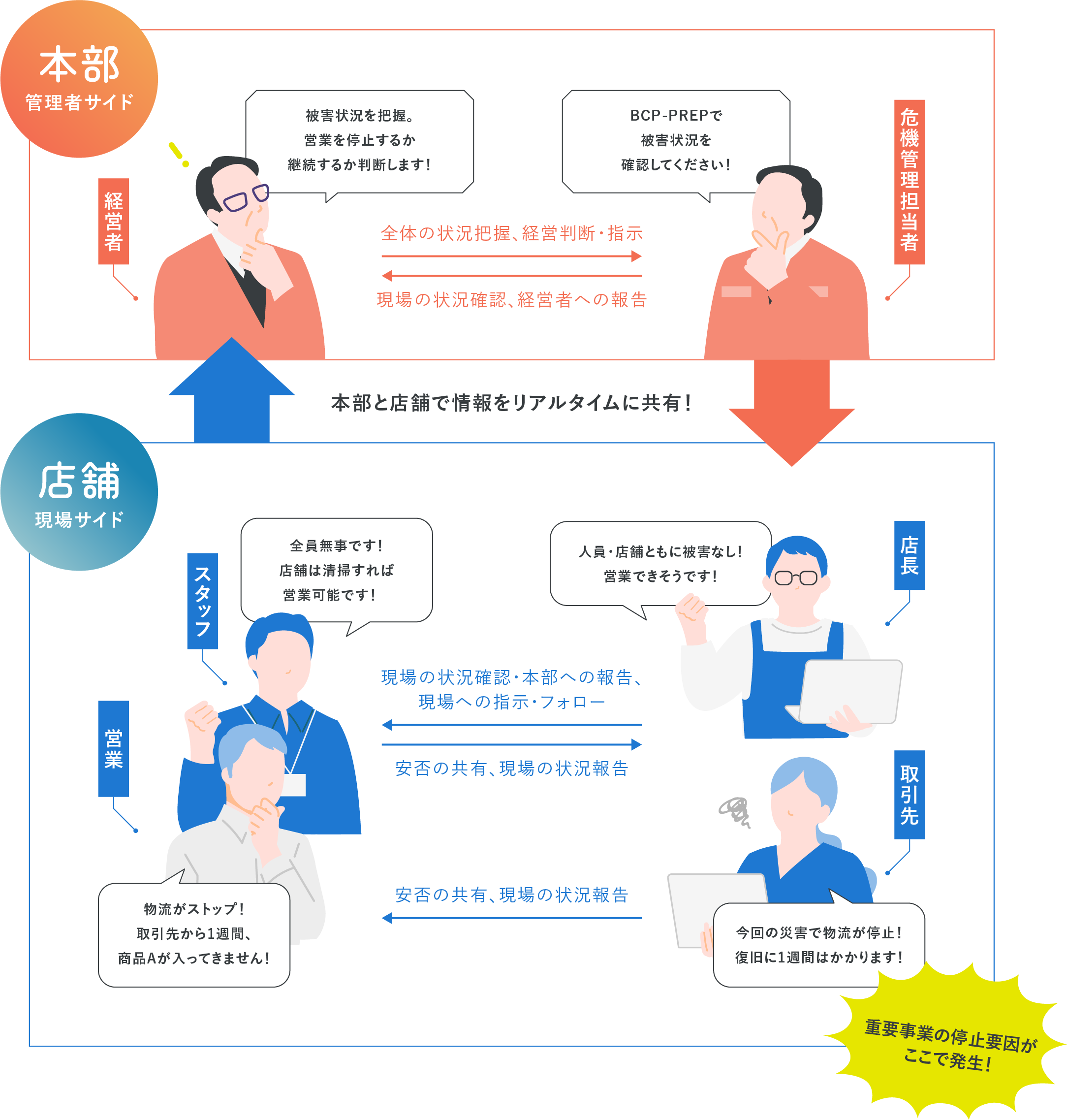 “統一対応”と“スピード共有”が不可欠全国に多数の店舗を持つ同社では、災害時の営業判断や対応が店舗ごとに任されており、情報共有や指示系統にバラつきが発生。特に現金や高価貴金属などの取扱いがある業態では、初動のミスが安全性や信用リスクに直結します。BCP-PREPを導入することで、全店舗に共通の行動ルールを設け、スピーディな事業継続判断が可能となります。