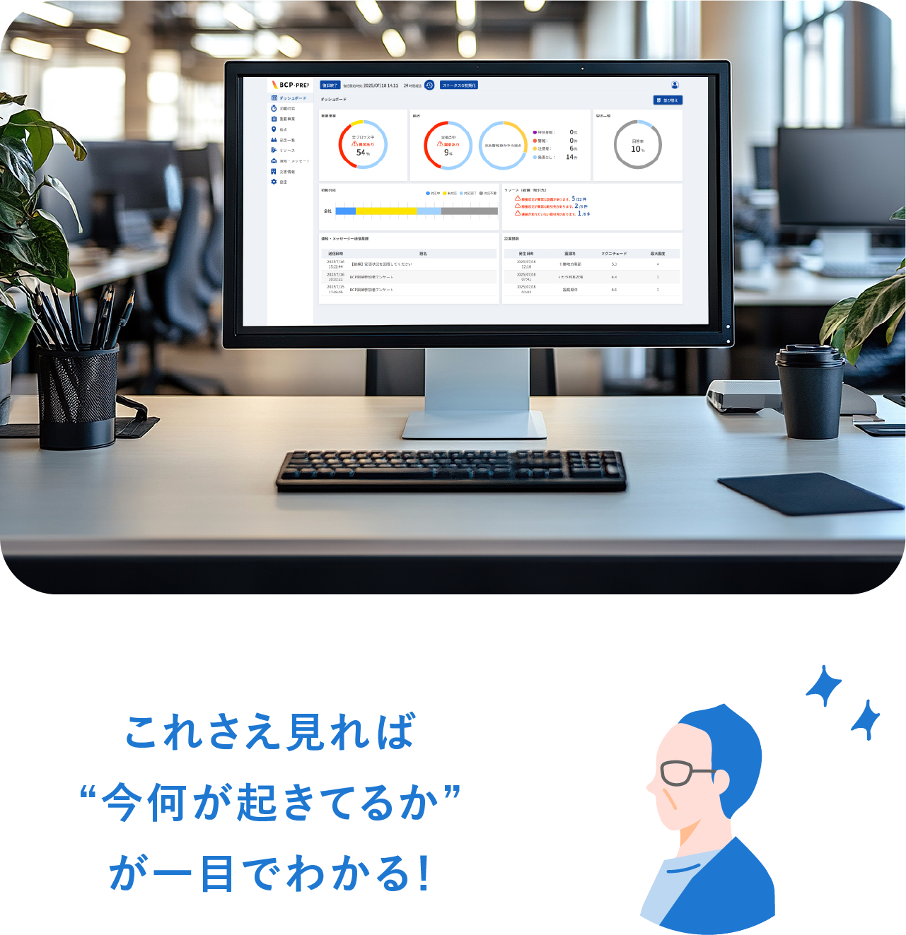 定期的な訓練はもちろん、台風・大雪・感染症などの“日常の異常”にも対応。出社・テレワーク状況や事業の進行状況が即時に把握でき、どこにいてもチーム全体の動きが見えるツールです。