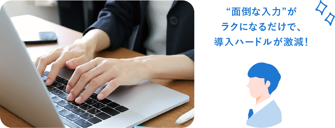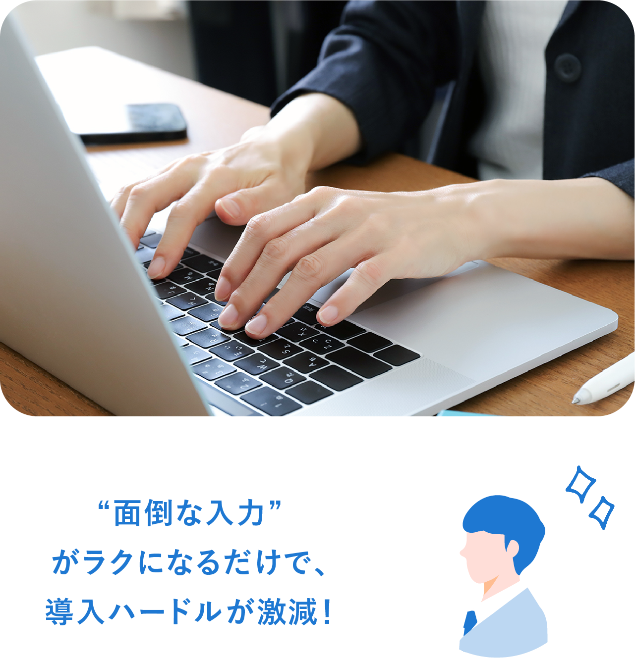 最初の情報登録が大変…そんな声にも対応。Excelテンプレートから一括取り込みできる簡易ツールで、従来の約10分の1の労力(※当社比)で導入できます。